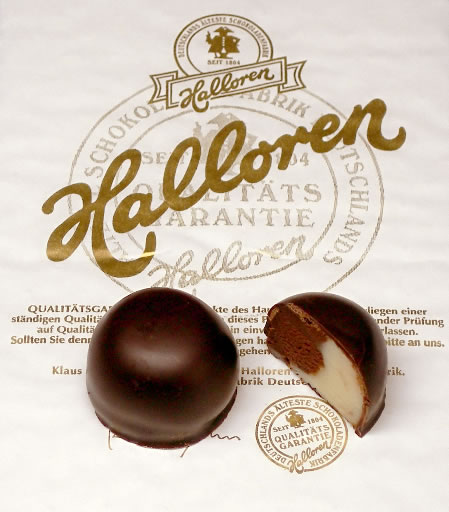 この町には「Halloren」という組合があって、金色のまん丸いボタンが彼らのシンボルです。この丸いボタンがHallorenkugelnの形と似ていたので、「Halloren」という名前をチョコボールに付けました。このチョコボールはチョコクリームとミルククリームが組み合わせっていて、とても美味しいです!あんこのような食感で、とても食べやすいですよ。